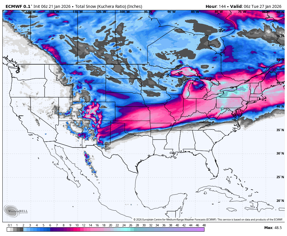 The model now shows a parade of major winter events: a wallop this weekend, then a second Arctic blast peaking Jan 29-31, followed by an even stronger third wave around Feb 2-4. This is not a brief cold shot. It is sustained Arctic influence.