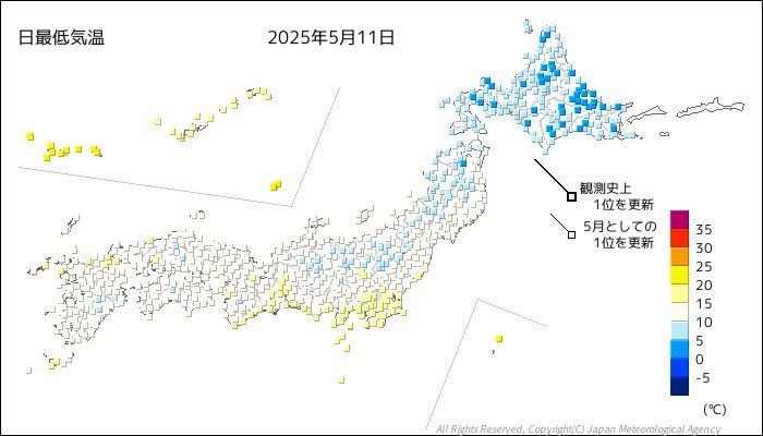 Minimum temperatures plunged across the country on May 11, with Amami and Okinawa notably affected. Tmins across the archipelago dropped to levels typically seen in mid-March, setting new records for early May.