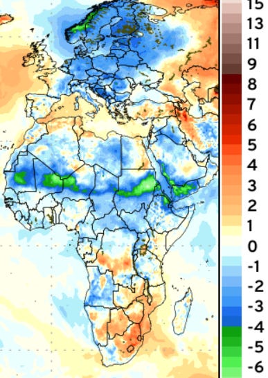 And so too has Africa, particularly the tropics. The Sahel and Horn show anomalies as deep as -6C on reanalysis (below) — an extreme departure for the region.