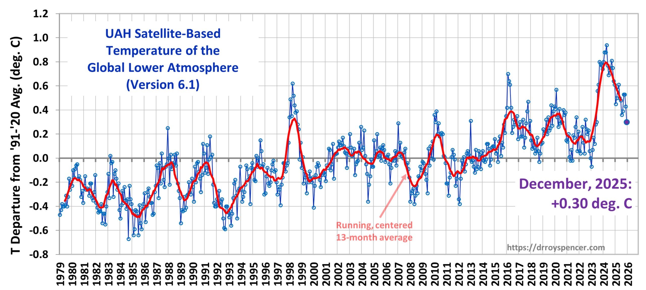 UAH satellite data show the global lower troposphere anomaly fell to 0.30C (0.54F) in December 2025, down from 0.43C (0.77F) in November, reinforcing the ongoing reversal since the 2024 Hunga Tonga/El Nino-driven spike.