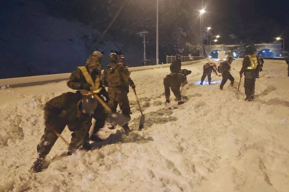 Some 800 vehicles were trapped for 19 hours on an expressway in central Japan on Wednesday. The 6 km (4-mile) jam occurred after two trailers got stuck in the snow, with the army having to called in to dig them out.